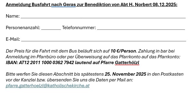 Am 8. Dezember 2025 findet um 14.30 Uhr im Stift Geras die feierliche Benediktion von Abt H. Norbert Lesovsky O.Praem statt. Die Pfarre bietet die Möglichkeit, gemeinsam mit dem Bus nach Geras zu fahren. Die Anmeldung ist ab sofort bis spätestens 25.11.2025 im Pfarrbüro oder per E-Mail möglich: pfarre.gatterhoelzl@katholischekirche.at, Anmeldeformulare liegen auch in der Kirche auf: Anmeldeformular.jpg (52251)
